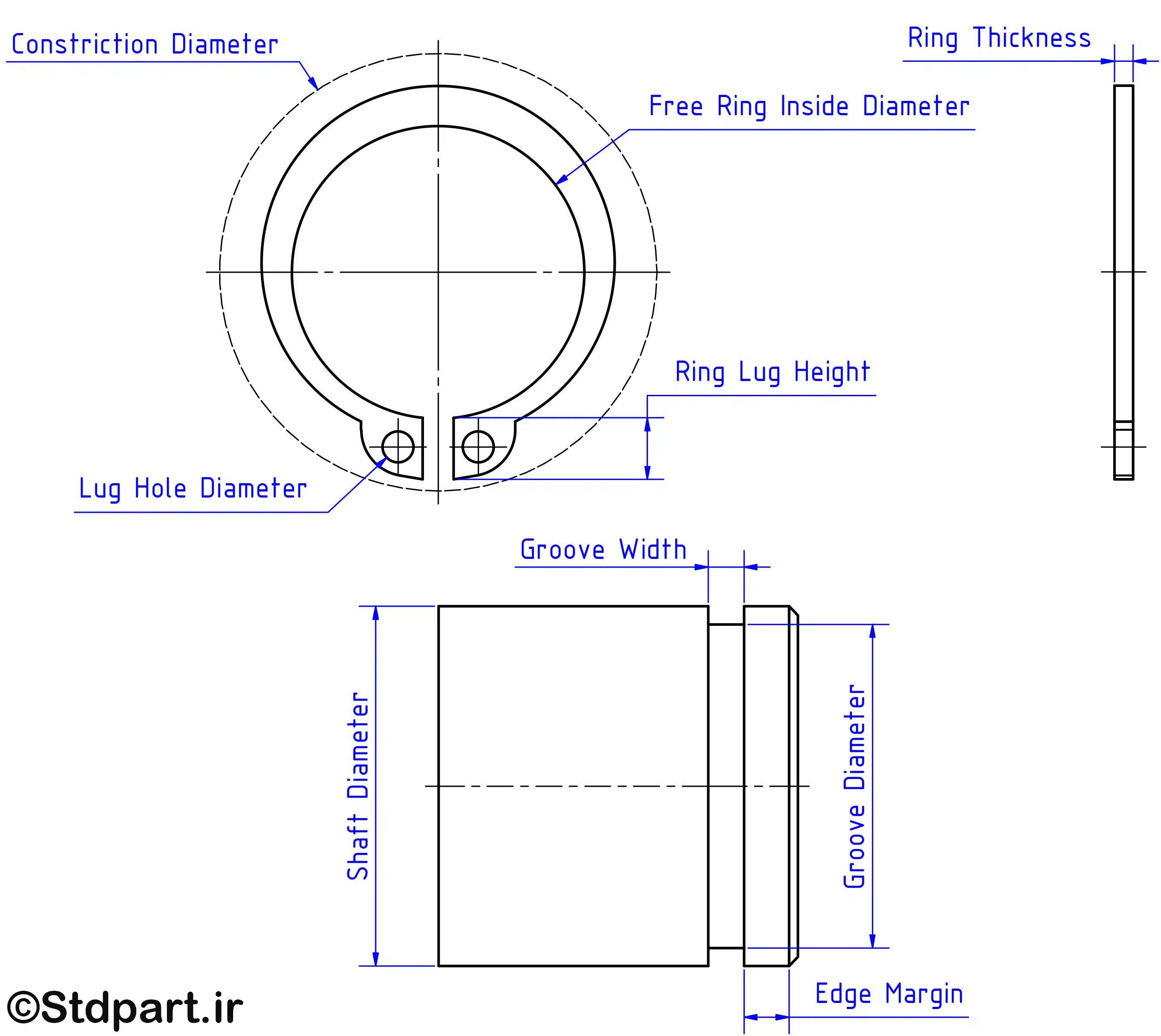 | Ring Inside Diameter [mm] | Edge Margin [mm] | Ring Thickness [mm] | Groove Width [mm] | Groove Diameter [mm] | Shaft Diameter [mm] | Part Number |